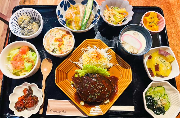 ランチタイムは、お好み焼きや鉄板焼きなどの単品メニューもオーダーできますが、それらを差し置いて人気なのが、週替わりのメイン料理3種から選べる小鉢付きランチ。5種類以上の小鉢に、ご飯・みそ汁・漬物が付いて満足度◎です。