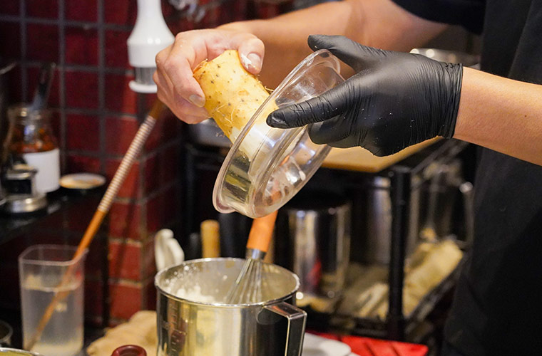 お好み焼きの命とも言える生地には、擦りおろしたヤマイモをたっぷり使用。そうすることで粘りのある生地に仕上がり、焼き上げるとふんわりと軽い食感になるのだそう。さらに、白だしや魚介系の乾燥だしをブレンドすることで、ソースを付けなくても、しっかりとうま味が感じられる味わいに仕上げています。