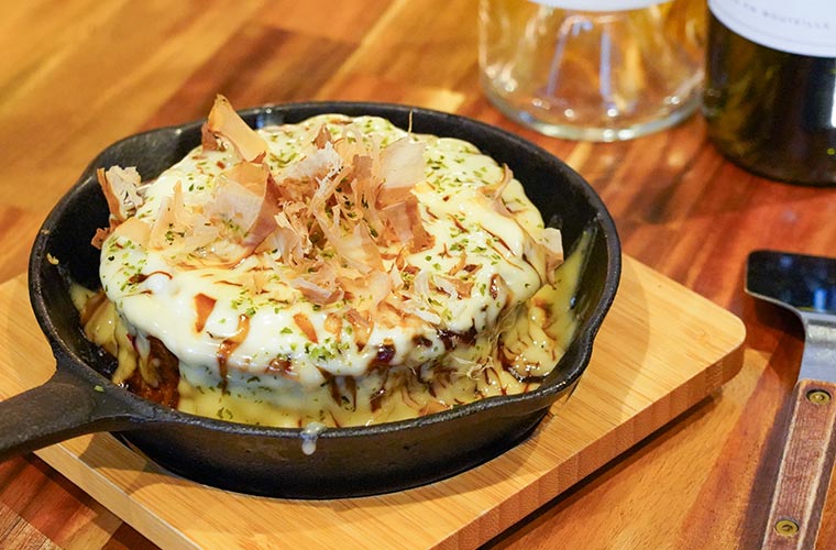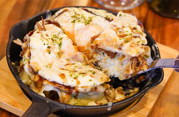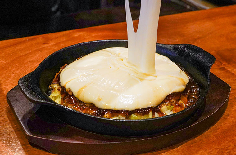 お好み焼きが見えなくなるほど、たっぷりとチーズをかけた“チーズフォンデュ風”も、訪れたらぜひ味わってほしい一品です。固すぎず、やわらかすぎない絶妙ななめらかさに仕上げるため、モッツァレラ・ゴーダ・チェダーの3種のチーズに、白ワインや牛乳、さらに出汁を加えているのだそう。ほんのりと出汁が香る和の味わいが、お好み焼きとチーズのハーモニーをやさしくつなぎ止めます。