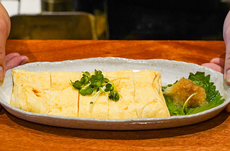 同店の出汁巻き玉子は、その名の通り鉄板で仕上げられる一品。卵3個分に白だしをたっぷりと合わせ、鉄板で一気に巻き上げることで、お箸では持てないほどのふわとろ食感に仕上がります。このとろけるような口当たりは、一度味わうと忘れられなくなりますよ。
