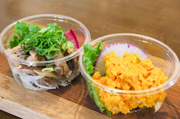 小さなカップに惣菜が入った『カップデリ』は、毎日日替わりで2種類ほどが店頭に並びます。この日は「ひねぽん」と「カボチャとベーコンのサラダ」が登場!ショーケースに並ぶ惣菜はもちろん、すべて手作りで一品一品丁寧に仕上げられたものばかり。カップ入りなので、あと一品ほしい時や、弁当に組み合わせられるのが魅力です。