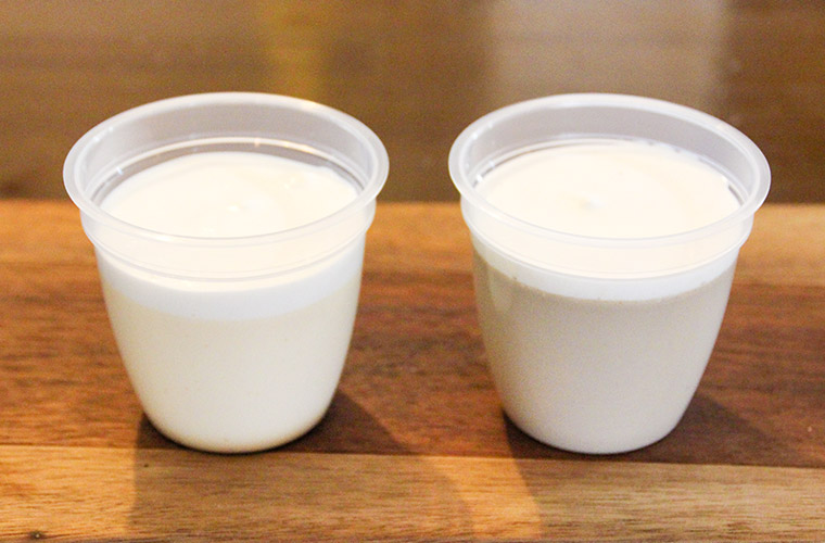 「バニラ」には下にカラメルが入っていて、甘さと苦みのバランスが絶妙。最後まで飽きずに楽しめる味わいです。一方の「カフェラテ」は、ほのかなコーヒーの香りが楽しめるまろやか仕上がりです。どちらも後味は驚くほど軽やかで、思わずもう一つ食べたくなります。