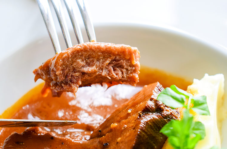 「歯がいらないほど柔らかい」とはまさにこのこと。箸を入れるだけでほろりとほどける牛タンに、ワインとトマトで仕上げたコク深いソースが絡み、なめらかなマッシュポテトが味わいを優しく包み込みます。一口ごとに、じんわりと広がるうま味を楽しんで。