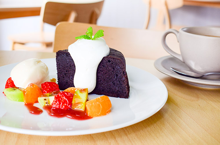 『ガトーショコラと季節のフルーツ盛合わせ』800円 『コーヒー』(ドリンクセット)300円