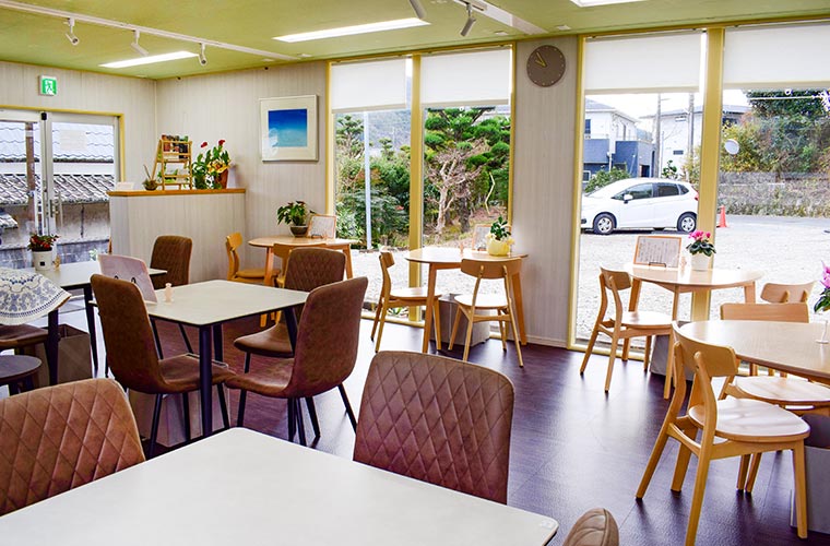 扉を開けると、やわらかな色調のナチュラルな空間が広がります。内装はすべて家族で手がけたそう。2人~4人がけのテーブル席や、カウンター席も用意されています。