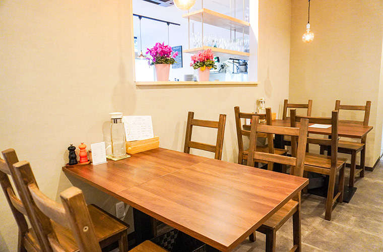 カウンター席の奥には、4人掛けのテーブル席が2卓あり、ファミリーや友人同士でも利用しやすいのがポイント。木の温かみに包まれた空間は、カウンター席とはまた違った落ち着いた雰囲気を楽しめます。