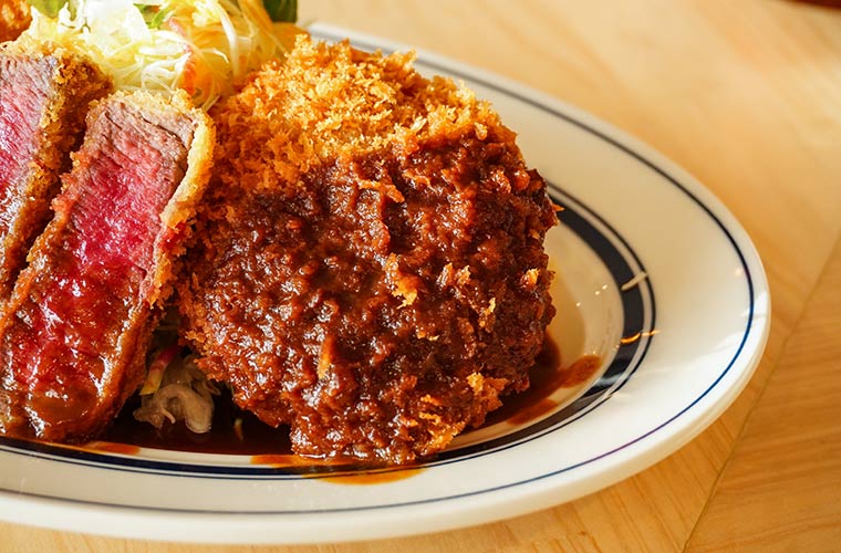 デミグラスソースを使った同店自慢の洋食の中でも、イチオシは「ビフカツ」。豪州産最上級ヘレ肉を使用し、ロゼ色に輝くレア仕上げで、口溶けの良い柔らかさが特徴です。