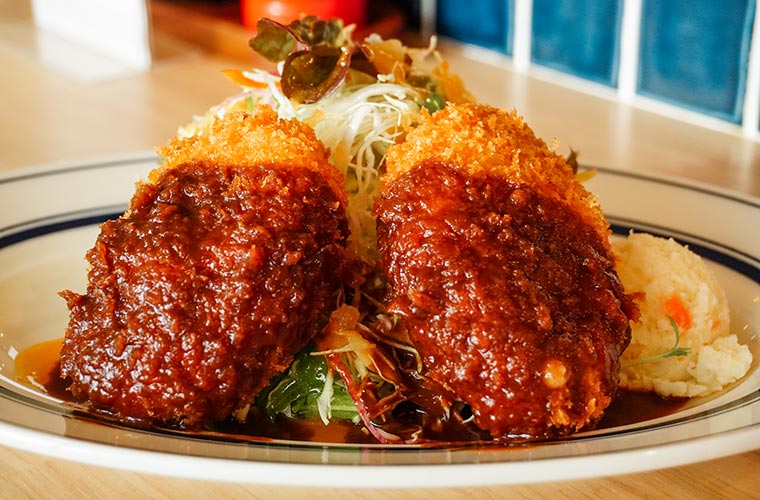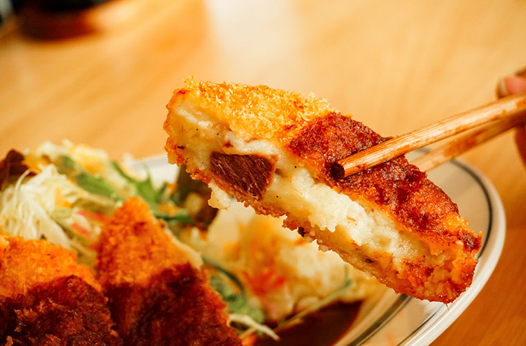 口当たりなめらかなマッシュポテトに、デミグラスソースを作る際に煮込んだ和牛を忍ばせたオリジナルのコロッケのおいしさの秘密は、ハチミツやチーズを加えたマッシュポテトにあります。とろけるような口当たりと優しい味わいに虜(とりこ)になること間違いなし!