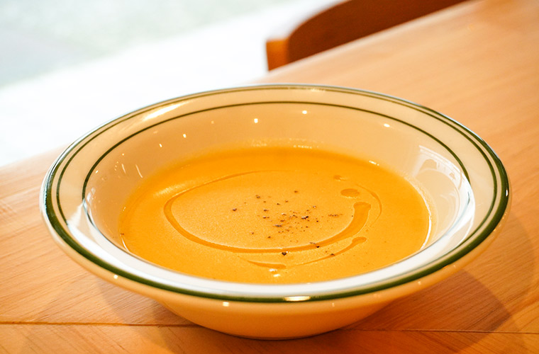 季節の野菜を使ったポタージュも、その時々で登場するので、見かけたらぜひチェックを。取材日には、地元で採れた「安納芋」のポタージュがお目見えしました。イタリア料理店で培った技法を取り入れて仕上げた一杯には、素材本来の甘みがしっかりと生かされています。