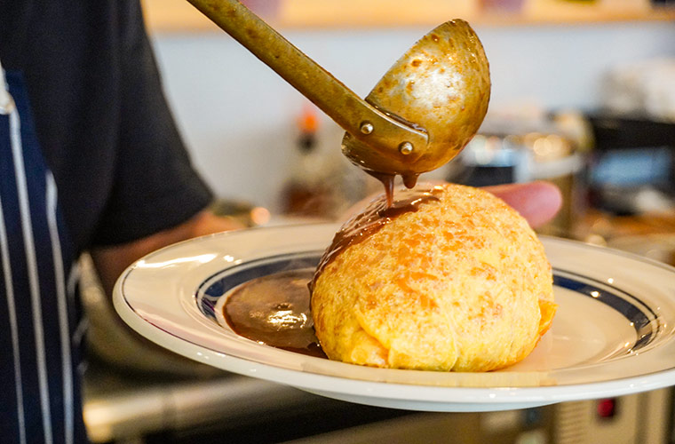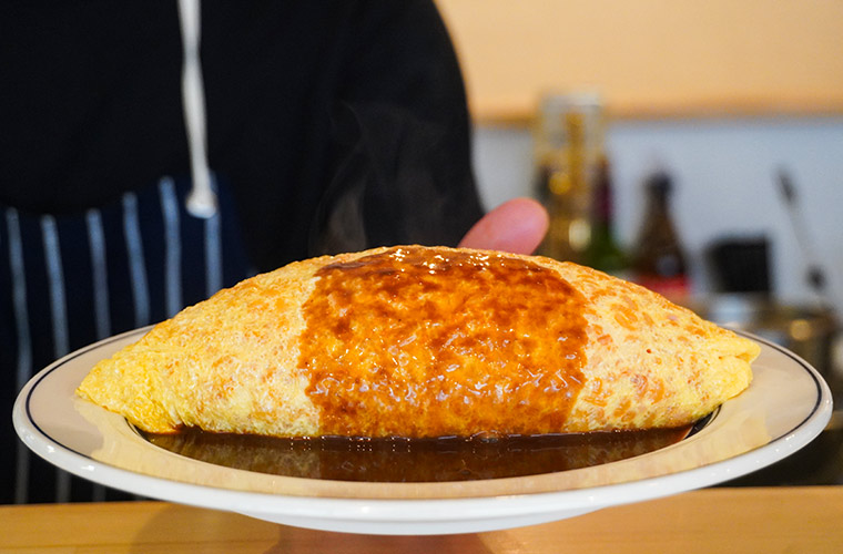 ビフカツと並ぶ店主のおすすめが、オムライス。その名の通り、わずか数ミリほどに薄く焼いた卵でケチャップライスを包んだ、どこか懐かしさを感じるビジュアルが魅力です。味はケチャップ、またはデミグラスソースから選べるのもうれしいポイント♪