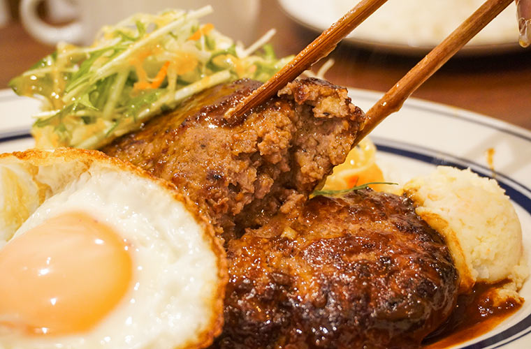 老若男女問わず愛されるハンバーグは、思わずステーキと言いたくなるような食感と食べ応えが自慢。一つひとつ手ごねで丁寧に作られた愛情たっぷりのハンバーグには、デミグラスソースがたっぷりとかけられています。
