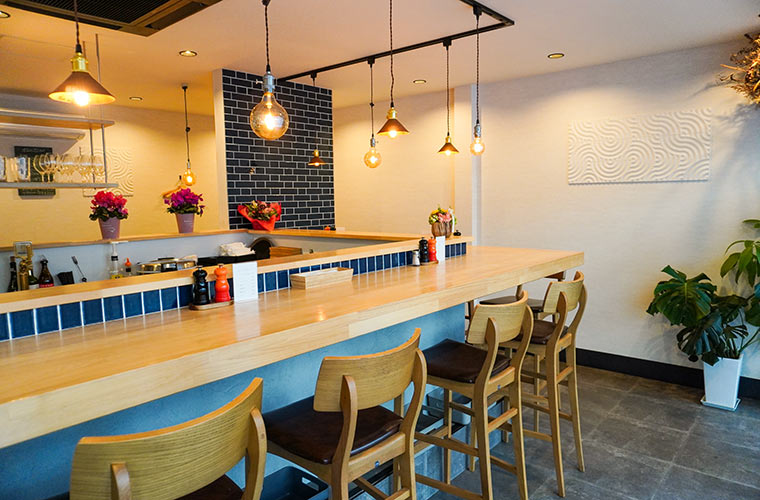 自身が大好きなネイビーをロゴやインテリアに取り入れ、個性が光るペンダントライトで遊び心を添えた、店主こだわりの空間。洋食店では珍しいカウンターメインのスタイルを採用したのは、「お客さんとつながれる距離感」を大切にしたかったからだそうです。老舗洋食店の味を守りながらも、肩肘張らずに楽しめる気軽さも、同店の魅力の一つです。