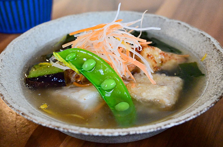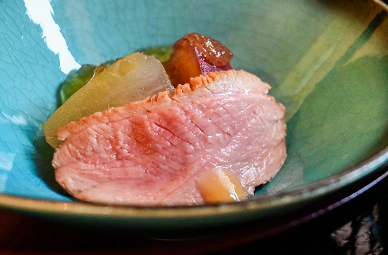 彩り豊かな小鉢にも、店主のこだわりが詰まっています。低温調理でしっとり仕上げた自家製鴨ローストは、ショウガを利かせたジュレでさっぱりと。ほかにも出汁が染みた季節野菜の炊き合わせ、食感が楽しい御津産レンコンのきんぴら、成山新田産大根の田楽など、どれも出汁を生かした優しい味わい。食感や風味に変化があり、最後まで飽きさせません。