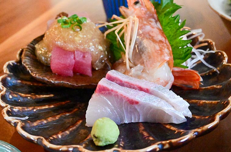 取材日のお刺身は、カンパチ、マグロ、赤海老の3種。濃厚なマグロには、ワサビを利かせたジュレを添え、爽やかな辛みがうま味を引き立てます。