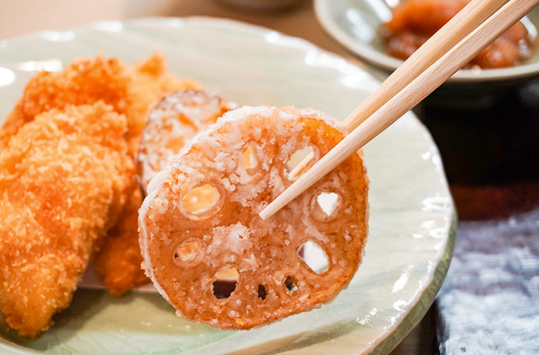 カツの横には、「加賀れんこん」をカラリと揚げた唐揚げも。「加賀れんこん」特有の糸を引く粘り気と、シャキッとした食感が楽しめる“素材が生きた”一品です。仕上げにぱらりとかけられたひとつまみの塩がたまりません。