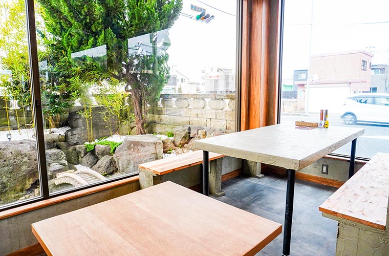 店内奥には、風情あふれる日本庭園が広がり、奥に配置された2卓では、この庭園を眺めながら食事を楽しむことができます。スタッフ自らが手入れをして蘇らせたという庭園は、季節ごとに表情を変え、訪れるたびに違った景色を楽しめるのも魅力。四季折々の風景に癒やされながら、ゆったりとした時間を過ごせます。