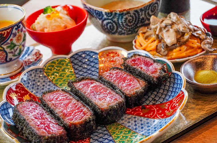 色とりどりの柄が描かれた華やかな九谷焼をはじめ、和の趣を感じるこだわりのお皿の上には、自慢の洋食メニューがずらりと並びます。和の器に洋食を盛り付けるという意外性も、同店の魅力の一つです。