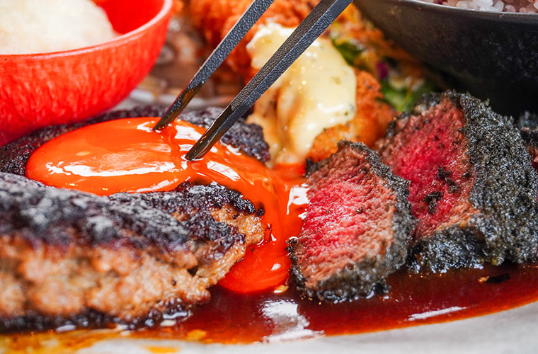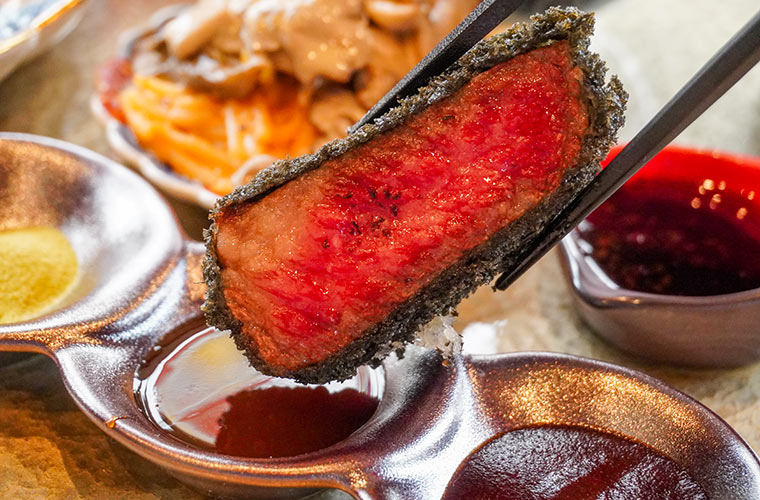 ビフカツに使用する肉は、牛もも肉の一部である「ラムイチ」という、やわらかさと赤身のうま味を兼ね備えた部位のみを厳選。その肉に、竹炭をブレンドした黒いパン粉をまとわせることで、見た目にもインパクトのある一皿に仕上げられています。