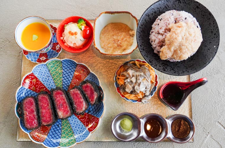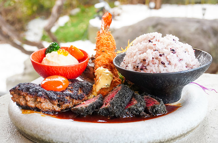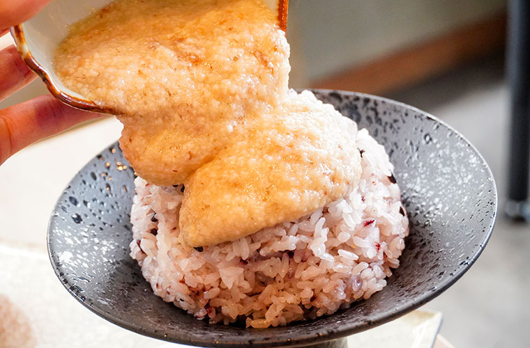 黒米ごはんは、ほんのりとした甘みともっちり食感が特徴。そこにとろろをたっぷりとかければ、お肉のコクをやさしく包み込んでくれる、箸が止まらない組み合わせに。とろろも黒米ごはんも何度でもおかわりできるので、遠慮せず、た~っぷりかけて心ゆくまで味わい尽くして。