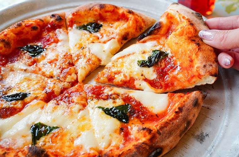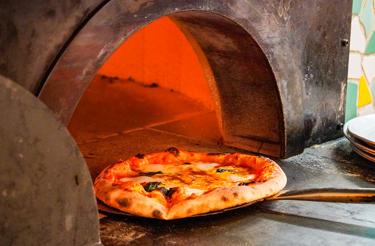 10種ほどあるピザの中でもイチオシは、定番の『マルゲリータ』。トマトソースにフレッシュバジルとモッツァレラチーズをトッピングした王道コンビは、間違いないおいしさです。窯から出したての熱々を食べれば、とろけるチーズにうっとり。焼きたてならではの香ばしさを、ぜひ味わって。