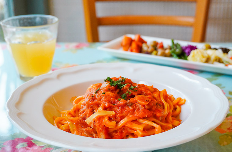 乾麺は大きく分けて、オイルベース、ジェノヴァ風バジルソース、トマトソース、クリームソース、和風の5種類のソースがラインアップ。気分に合わせて選べる楽しさもあり、何度訪れても飽きずに味わえます。