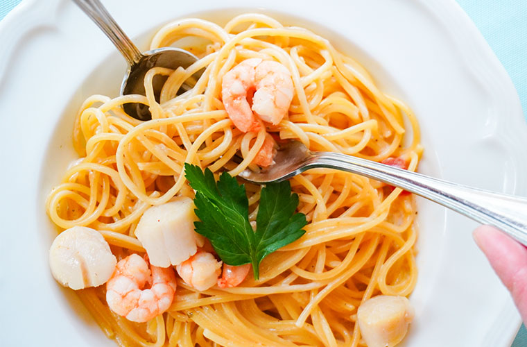 パスタメニューはピザ以上の約40種類がずらり。麺は、つるんと口当たりなめらかな細めの乾麺と、もちもち食感が楽しめる生パスタ「フェットチーネ」から選べます。ソースもオイル系、トマト系、クリーム系まで豊富にそろい、その日の気分に合わせて選べるのも魅力です。