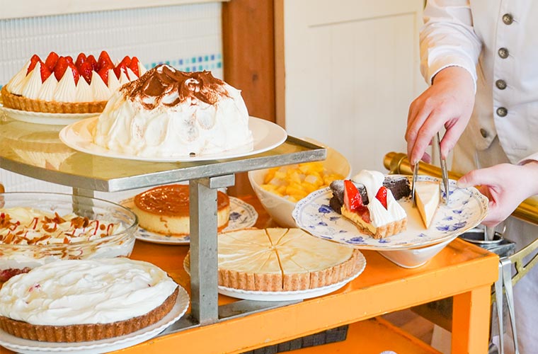 ランチタイムはプラス495円で、ケーキワゴンから好きなスイーツを3種類選べる『手作りドルチェ(3種盛り合わせ)』を付けることができます。ホテルのコース料理のように、スタッフがケーキをのせたワゴンをテーブルまで運んできてくれるので、子どもも大人もテンションが上がること間違いなし!パティシエお手製のケーキをはじめ、ワゴンには9〜10種類ほどのスイーツがずらりと並びます。
