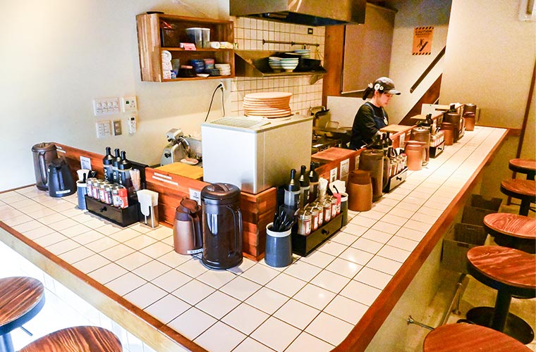 カウンターの調味料で味変も楽しんで。酢や黒こしょうを加えれば、ぐっと引き締まった味わいに。自分好みにカスタマイズできるのも、同店の醍醐味です。