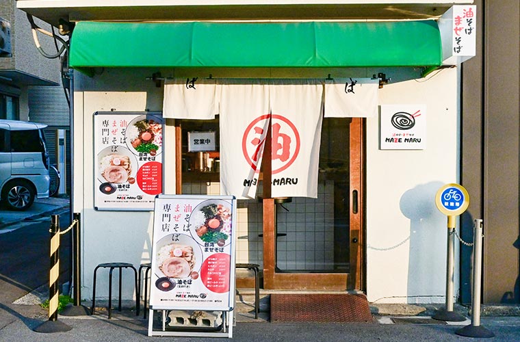 山陽姫路駅から徒歩約5分。飲食店が立ち並ぶ一角に、「油」の文字が描かれた暖簾が揺れています。姫路で15年続く人気ラーメン店「丸十(まるじゅう)」のオーナーが、「丸慶(まるけい)」に次ぐ新たな挑戦として2025年11月にオープンした、まぜそば専門店「油そば・まぜそばMAZEMARU(まぜまる)」です。