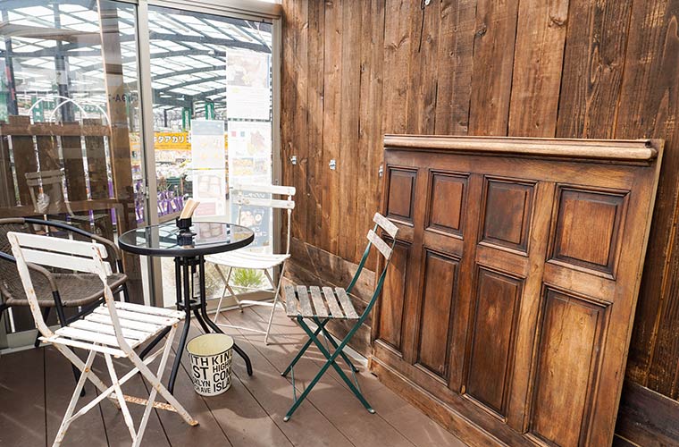 もともとテラスだったこの場所は、自社の大工の協力のもと、スタッフ自らがリノベーション。木材に塗料を塗ったり、岡山県のアンティークショップで家具を買い付けたりと、細部までこだわって空間を作り上げたんだとか。ホームセンターならではの強みを生かしながら完成した、ほっとくつろげる居心地のよいスペースもぜひ利用してみて。