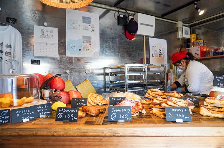 カウンターの上には、パンとスイーツあわせて10種類ほどがずらり。目の前のオープンキッチンで作られれていて、運が良ければ焼き立てのアップルパイと出合えることも。香ばしい香りに包まれる、うれしい瞬間に立ち会えたらラッキーですね♪