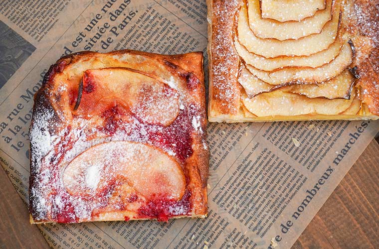 デニッシュ生地の上にレモンのスプレッドを塗り、その上にリンゴのスライスを均等に重ねた、美しいビジュアルが目を引く『アップルパイ』。同店のオープンにあわせて、「レゾンデートル」のオーナーが考案した新メニューです。「アグロガーデン」で販売している青森県産のリンゴを使用するなど、素材選びからこだわりが満載!