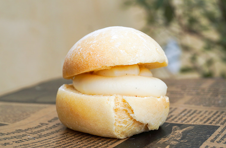 アップルパイに加え、自家製パンも、ほかの「レゾンデートル」系列店では味わえないここだけの限定メニュー。手のひらサイズの小ぶりな白パンに、カスタードと生クリームを合わせたディプロマットクリームをちょこんと挟んだ『クリームパン』は、スイーツ感覚で楽しめる愛らしい一品です。ほんのり甘く、軽やかな口当たりで、小腹を優しく満たしてくれます。