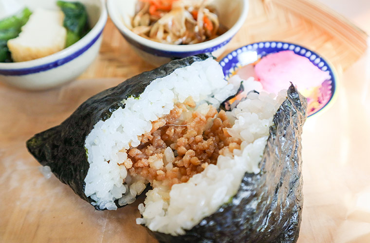 『甘辛鶏そぼろ』は、ホロホロとした鶏そぼろを包み込んだ人気メニュー。控えめな醤油ベースの味付けは存在感がありながらも重たすぎず、あっという間に食べ切ってしまいます。