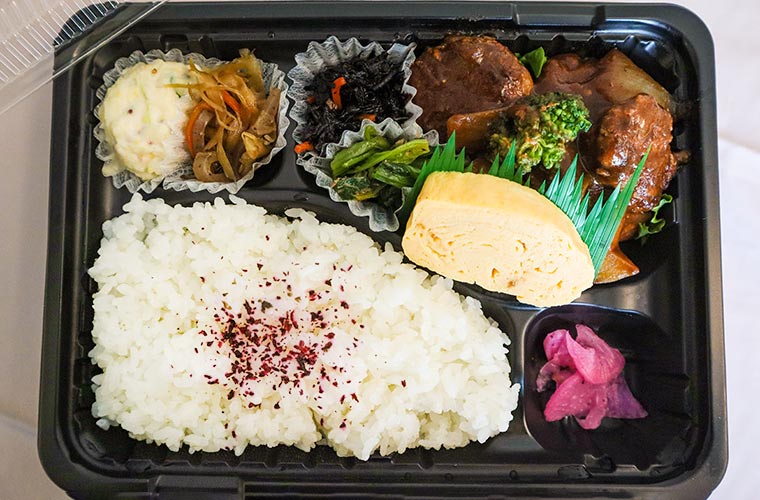 取材日は日替わりでおかずの内容が変わる『おふくろ弁当』をチョイス。“手作りで体に優しいもの”にこだわるおかずは、家庭的でありながらどれも丁寧な味わい。ビーフシチュー風ソースがかかった肉感たっぷりのハンバーグ、田舎の懐かしい味を感じさせる卵焼き、小松菜のお浸しとひじき煮、きんぴらごぼう、タマネギのシャキシャキ感がアクセントのポテトサラダが入った満足感たっぷりのラインアップでした。