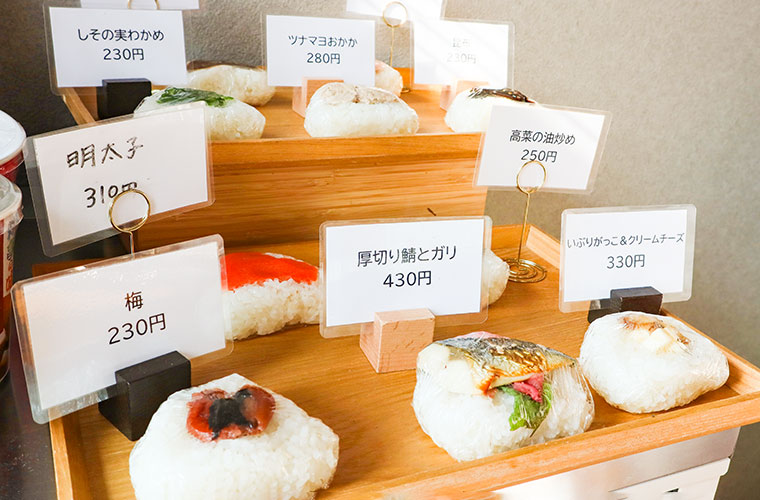 約20種類から選べるおむすびは、『昆布』『明太子』といった定番から、『いぶりがっことクリームチーズ』『そぼろ卵黄』などの変わり種まで幅広くラインアップしています。