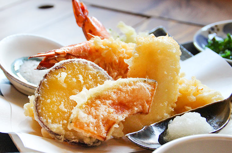 揚げたての天ぷらは衣が軽く、中でもエビはぷりぷりで歯応えもしっかりとした食感の大エビを使うのがこだわり。野菜は季節で変わり、ブロッコリーと春菊、ダイコン、カボチャ、サツマイモが盛られています。サツマイモは、なんと一度焼き芋にしてから揚げられているとか。塩にもめかぶが入っているなど、店主のこだわりが詰まっています。