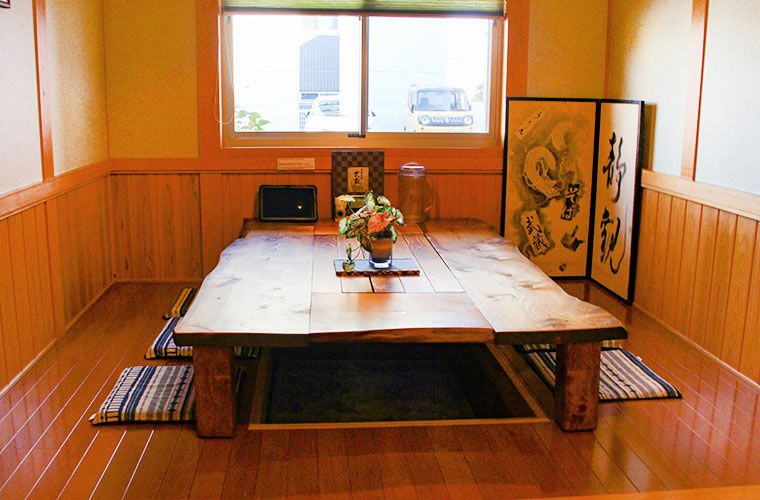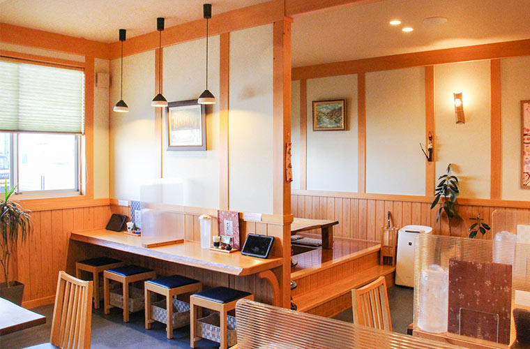 小上がり座敷席は掘りごたつになっていて、友人や家族ともゆっくりと過ごせます。木がもてなす温かな空間では、そばを待つ時間ですら楽しめそう。