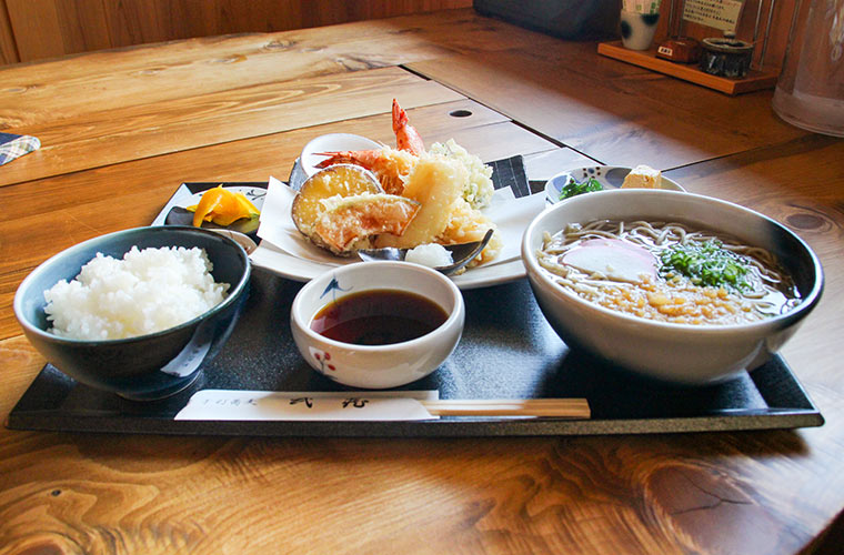 中でもイチオシは『天ぷら定食』。温かいそばに天ぷら6種盛りと小鉢が付いた、満足感たっぷりの一膳です。