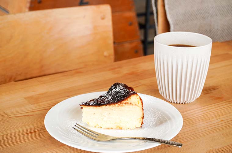 モーニングやスイーツも充実し、自家焙煎のコーヒーは時間帯問わずスタンバイ。濃厚ながら甘さは控えめ、後味スッキリの『バスクチーズケーキ』は、同店自慢の『オリジナルブレンド』と相性抜群です。