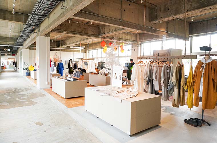 職員室だった横長の空間を生かした「ギャラリー&ショップ」には、5ブランド以上の洋服がずらり。ここに並ぶのは、一点一点にストーリーとデザイナーの思いが込められたアイテムばかりです。