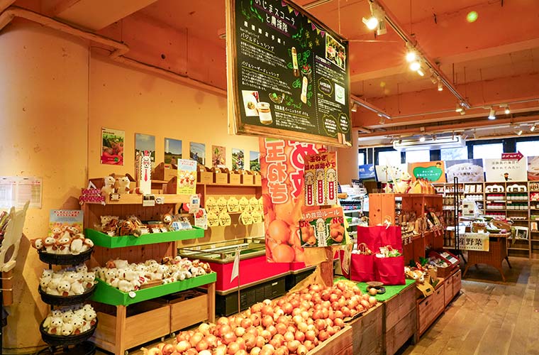 ベーカリーの隣にある「のじまマルシェ」では、新鮮な野菜が並ぶファーマーズマーケットや地元の特産品など約250種類もの商品が勢ぞろい!淡路島タマネギを袋いっぱいに詰められる『タマネギ詰め放題』(通常 600円、新タマネギ 1,000円)もあるとあって、挑戦する人が後を絶ちません。