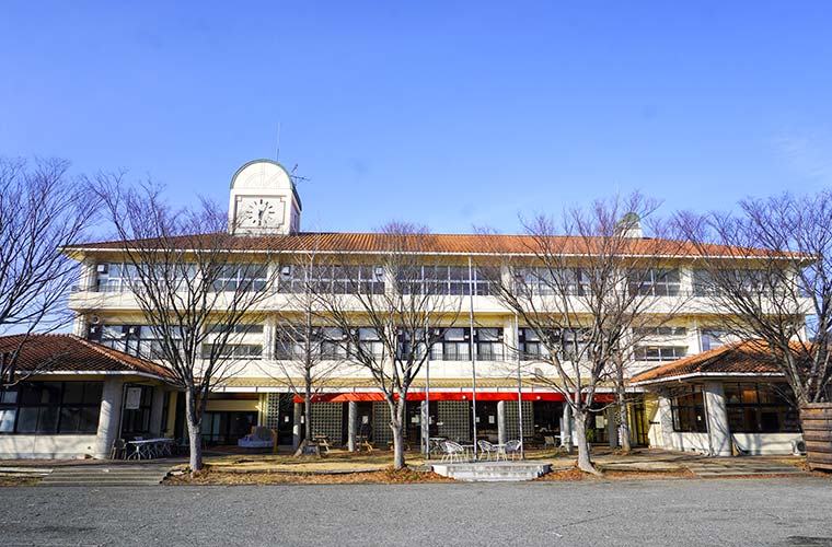 黒の格子窓と赤いテントが目を引く、レトロな外観が印象的。校舎のシンボルでもある大きな時計は当時のまま大切に残され、今も変わらず時を刻んでいます。