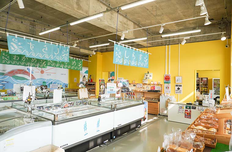 「さの小カフェ」の隣には、新鮮な農産物や海産物、加工食品などを販売する直売所も併設。淡路島の良質で新鮮な食材がお得に購入できるとあって、観光客から大人気!ほかにも校内には、水産加工の現場を無料で見学できる工場や、自家製パンを使ったハンバーガーやスナックを販売する「しらすベーカリー」も併設。見て、味わって、買って楽しめるのも魅力です。