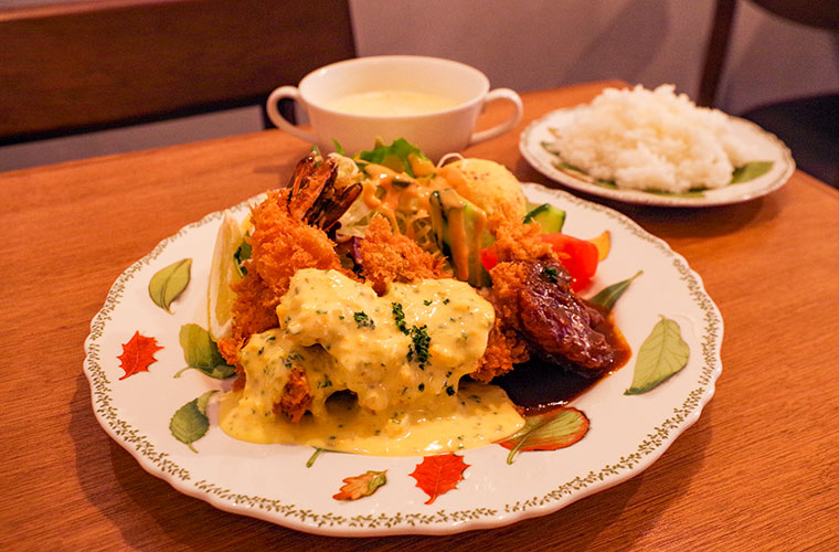 この日のメインは、「明石鯛のフライ」。日によって「チキンカツ」や「カキフライ」など、メニューが変わるので、どんなメイン料理と出合えるかは訪れてからのお楽しみ。平日11:00〜15:00の数量限定メニューなので、お目当ての人は早めの来店がオススメです。