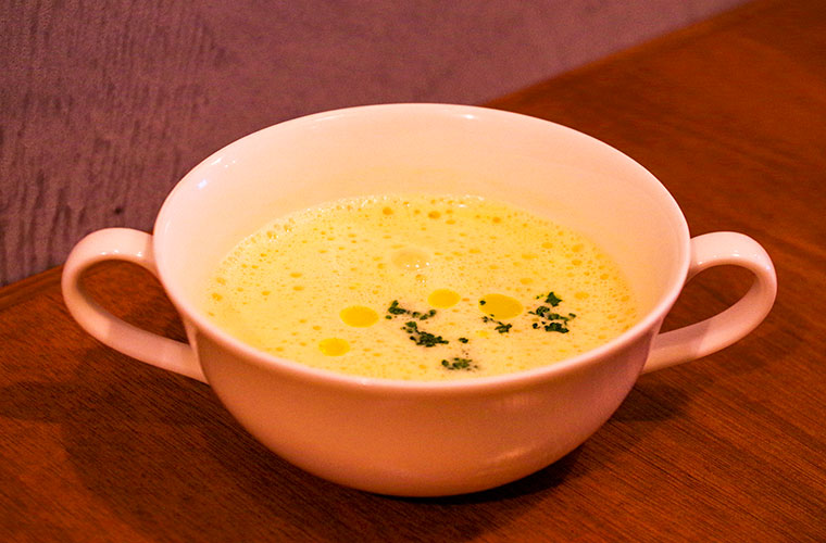 メインやソースはもちろん、サラダやドレッシングまですべて手作り。中でも全てのメニューについてくるポタージュスープは、素材の味わいが上品に引き出されていて、ポテトサラダは粒マスタードがアクセントに。付け合わせの一つひとつまで丁寧に仕上げられています。
