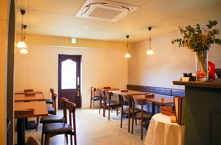 扉を開けると、奥行きのある店内に、テーブル席が26席。アンティークのライトから落ちる温かな光が、洗練されつつも落ち着いた空間を演出しています。一人でゆっくりとランチを楽しむ人や家族連れの姿も見られ、思い思いの時間が流れています。