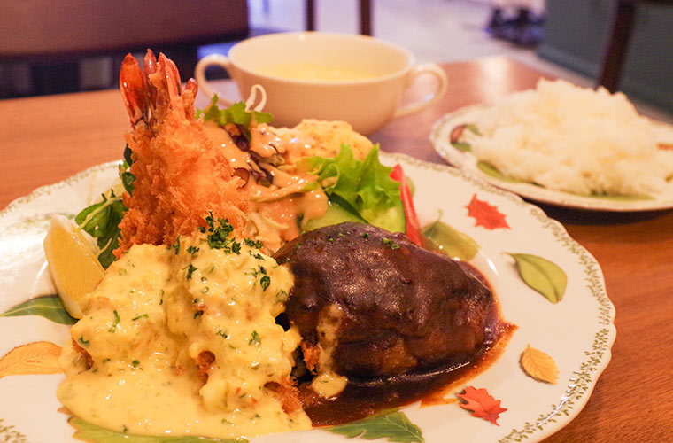 同店のランチメニューは、フライからグリル料理まで幅広くそろっていて、全てにライス・ポタージュスープとサラダが付きます。一番人気は、神戸牛と淡路牛を合わせたミンチを100%使用したハンバーグに、エビフライが2本も添えられた『和牛ハンバーグとエビフライ』。