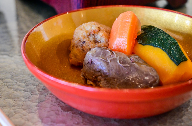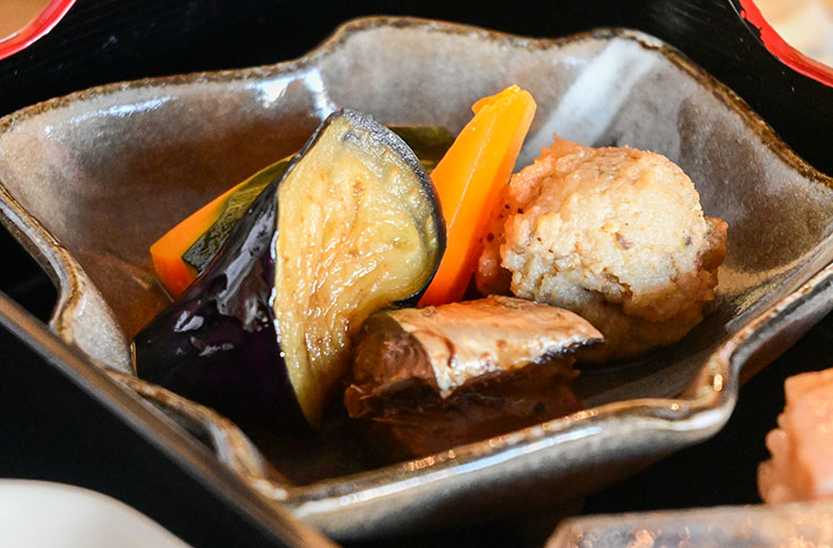炊き合わせは、野菜に加えて卯の花と魚のすり身を揚げてから炊くという、手の込んだ一品。口に入れた瞬間にほどける繊細な食感は、一度食べたら忘れられません。