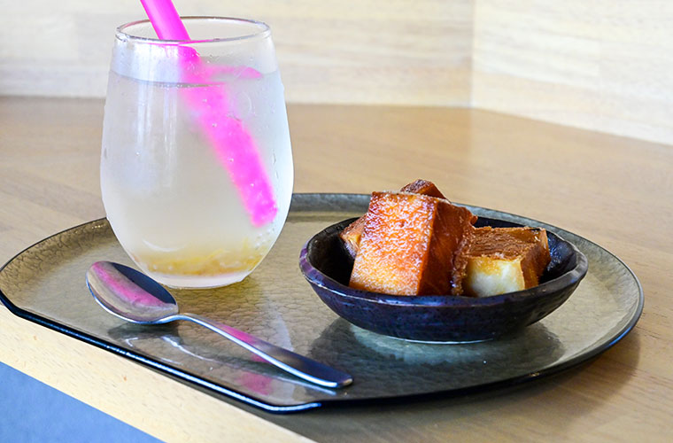 ドリンクは、果肉入りソーダ割りや水割りを用意。フレーバーは柚子やイチゴ、カシス、ミカンの4種から選べ、食事と一緒に爽やかな味わいを楽しめます。